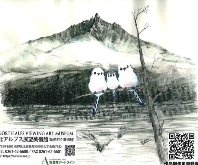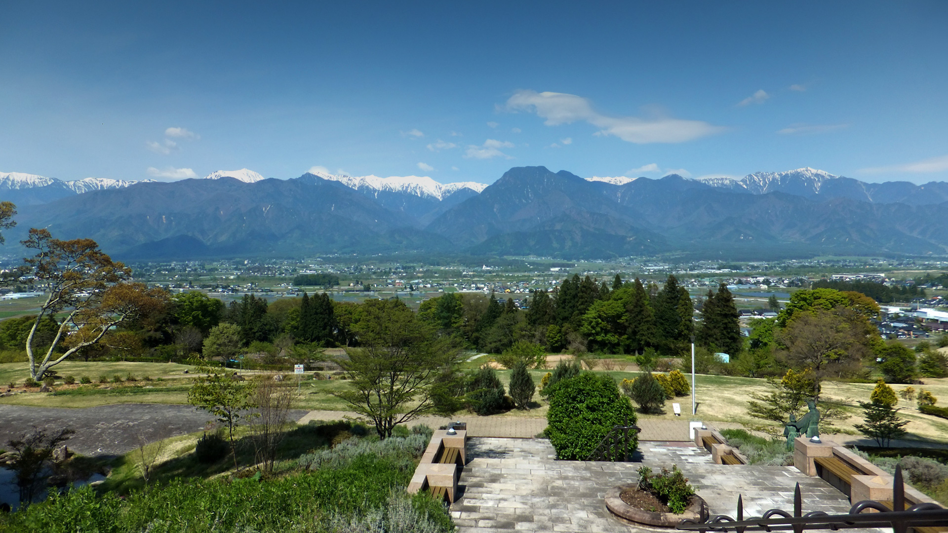 北アルプス展望美術館(池田町立美術館)は、正面に北アルプス連峰と安曇野の広大なパノラマを一望できる丘のうえにあります。北アルプスの山々、のどかな田園風景・・・。