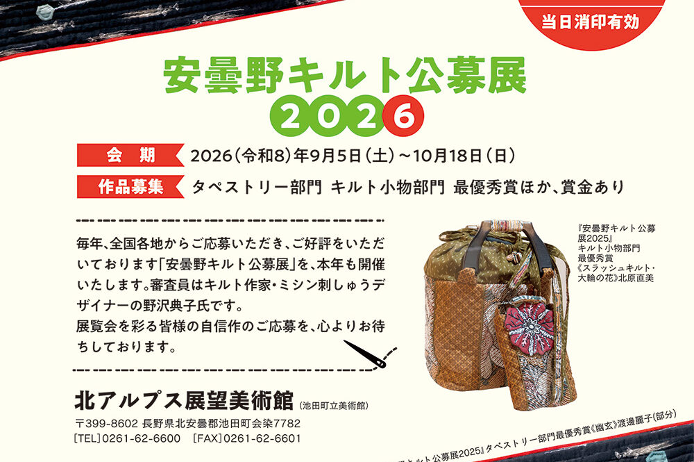 毎年、全国各地からご応募いただき、ご好評をいただいております「安曇野キルト公募展」を、本年も開催いたします。審査員はキルト作家・ミシン刺しゅうデザイナーの野沢典子氏です。